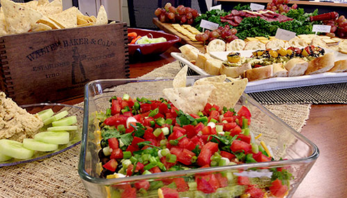 Shaped like a football field on a kale turf, it includes red grapes, whole wheat crackers and summer sausage.